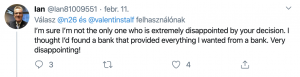 Egy másik ügyfél azt nyilatkozta, hogy csalódott a digitális bank bejelentését illetően, annak ellenére, hogy nagy rajongója a szolgáltatásainak. Úgy érzi magát, mint akit cserben hagytak. Szerinte a bank soha nem jelezte az ügyfeleinek, hogy az EU-ból való kilépés megnehezítené, illetve befolyásolná a cég jövőjét. Úgy gondolja, hogy nem a Brexit a hibás.